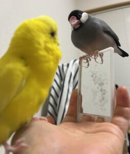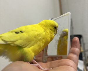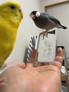 大好きな鏡の中のトリと遊んでご機嫌なルネちゃん🐥